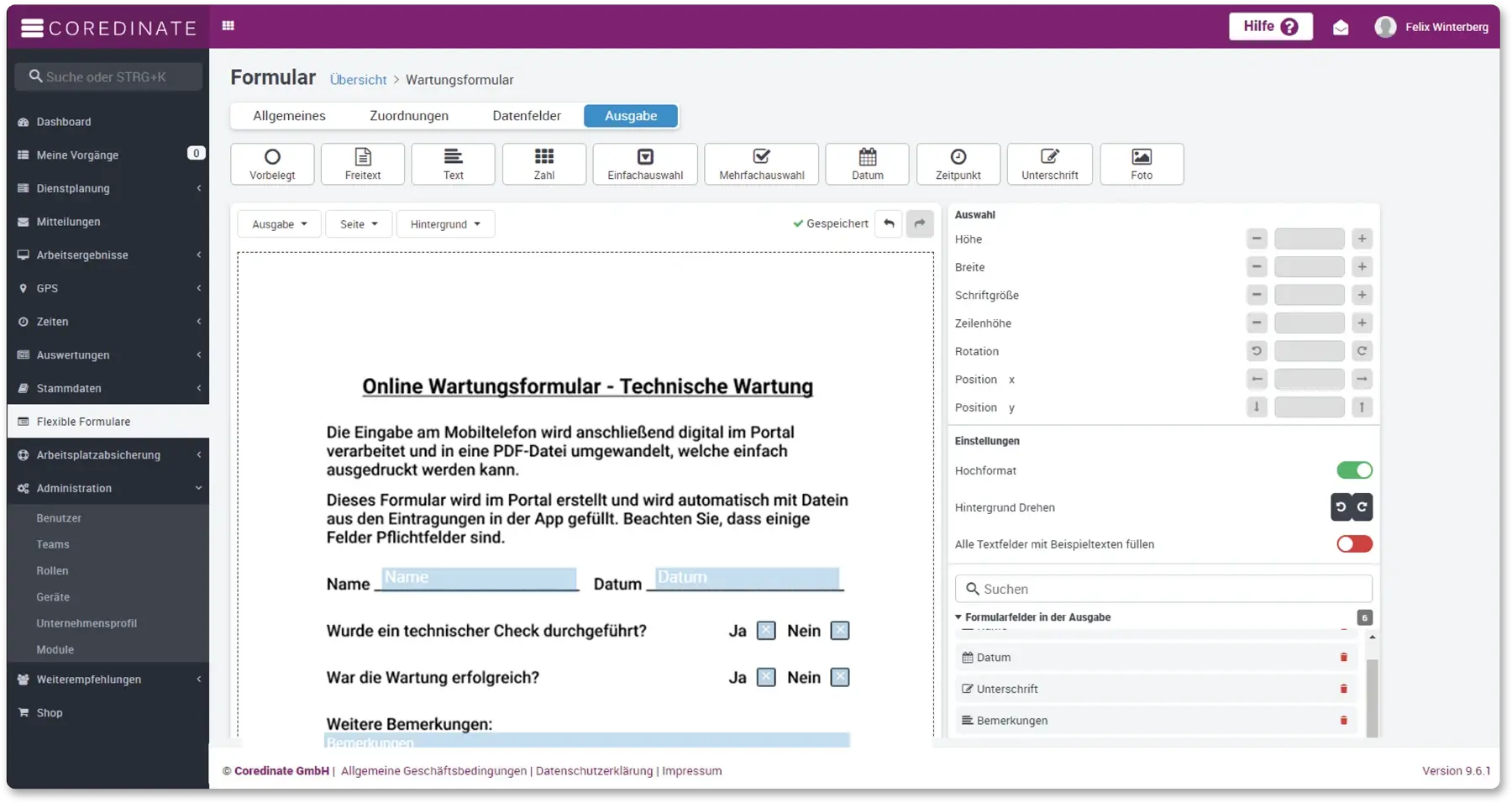 Avec la fonction Formulaires flexibles de COREDINATE, vous pouvez transférer presque tous les formulaires du format papier au format numérique. Cela vous permet non seulement une flexibilité maximale, mais garantit également que vous ne receviez que les informations dont vous avez besoin. Vous pouvez équiper les champs individuels d'options de réponse, permettant à vos employés de sélectionner les options appropriées. De plus, toutes les informations obligatoires sont demandées de manière fiable en marquant les champs correspondants comme champs obligatoires.
