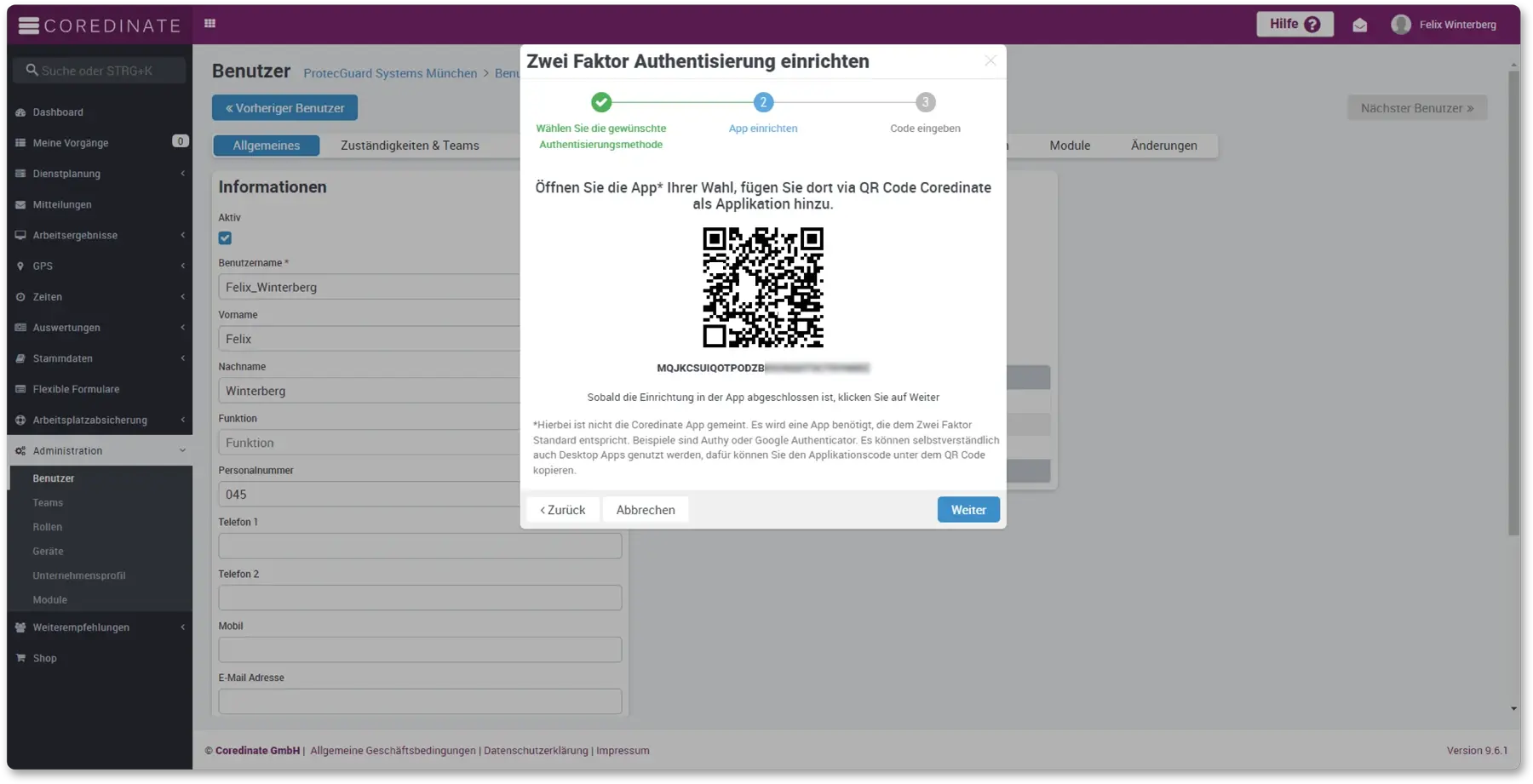 Nach Eingabe des Codes in COREDINATE hat sich der Nutzer durch die zusätzlich gesicherte Anmeldung erfolgreich im System angemeldet und kann dieses wie gewohnt nutzen. Der Code, der aus der Identifikations-App generiert wird, ändert sich regelmäßig nach wenigen Minuten und kann dadurch nicht durch Dritte genutzt werden.