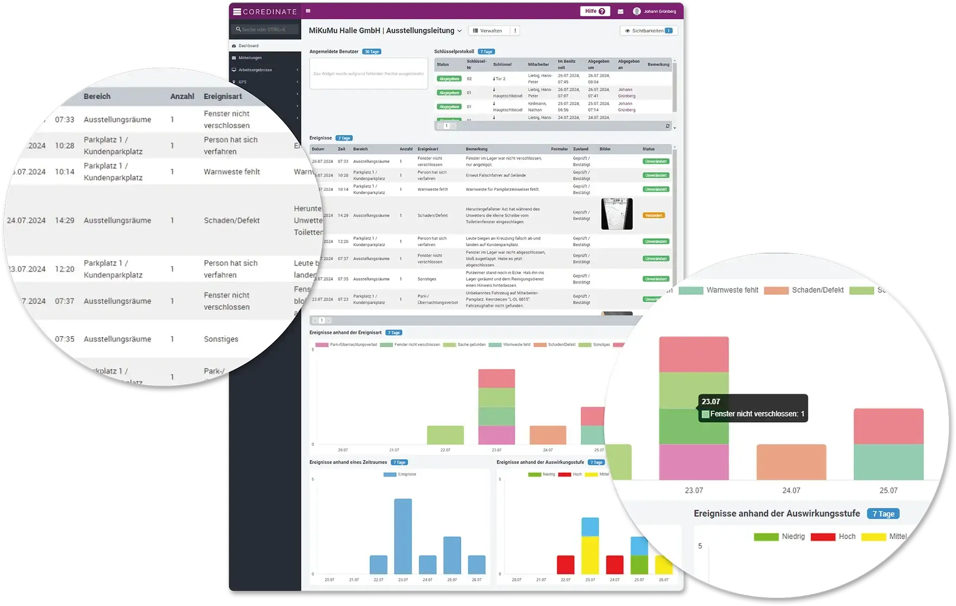Wenn Ereignisse durch Sicherheitsmitarbeiter erfasst werden, erscheinen diese mit den jeweils dazu verfassten Details im Dashboard. Neben den Standardangaben wie Datum, Uhrzeit, Bereich und Ereignisart besteht für den Sicherheitsmitarbeiter ebenfalls die Möglichkeit, Bemerkungen und Fotos zu protokollieren. Anhand des Schlüsselprotokolls ist nachvollziehbar, wo sich wichtige Schlüssel gerade befinden. All diese Angaben findet Johann Grünberg in Echtzeit auf seinem Dashboard. Der Zustand eines Ereignisses und die vorher definierte Auswirkungsstufe für dieses Ereignis zeigen an, ob und wie dringend Handlungsbedarf besteht. Ob Grünberg sich diese Daten tabellarisch oder doch in Form von Grafiken ausspielen lässt, kann er durch die Nutzung verschiedener Widgets selbst entscheiden.