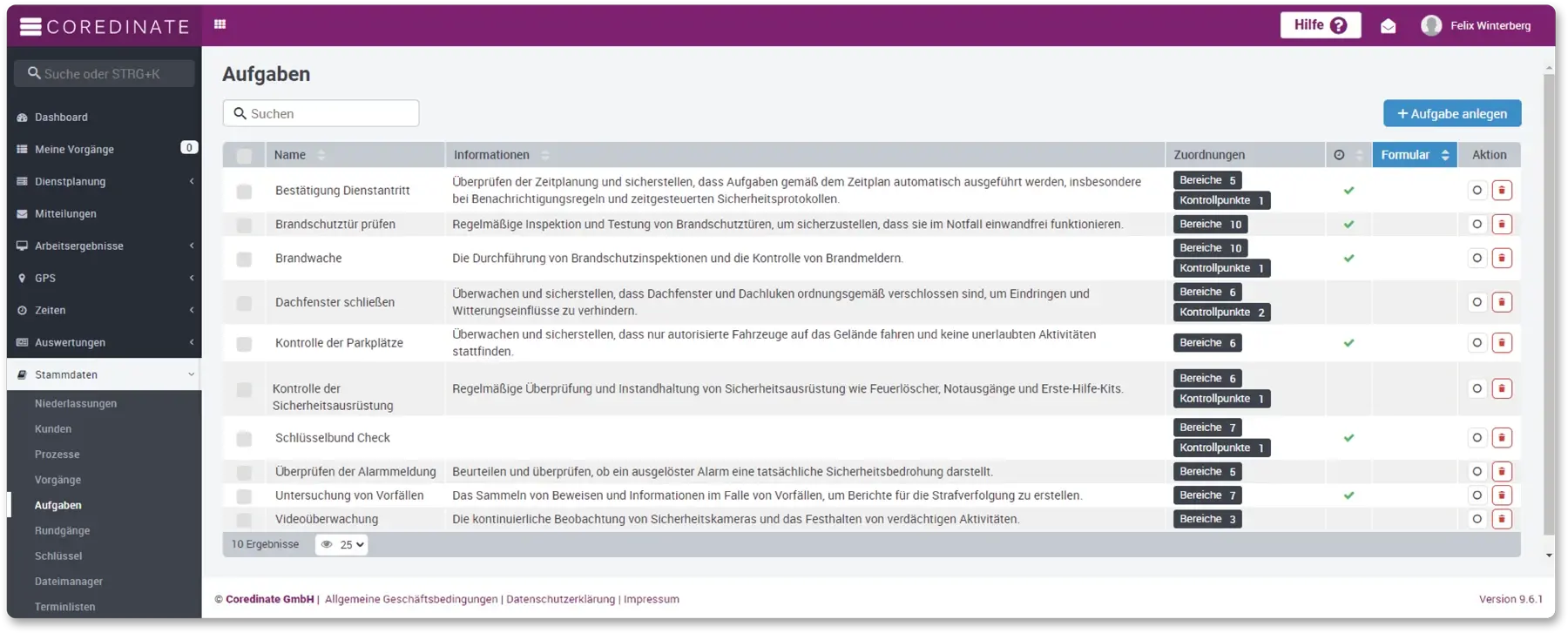 Im COREDINATE Portal können Aufgaben erstellt werden, welche immer erledigt werden können, also auch immer in der COREDINATE App sichtbar sind, oder Terminaufgaben, welche nur zu bestimmten Zeitpunkten oder innerhalb bestimmter Zeiträume sichtbar und verfügbar sind. So behält Anton Bär jederzeit die Oberhand, kann aber trotzdem jeden Rundgang sehr flexibel gestalten.
